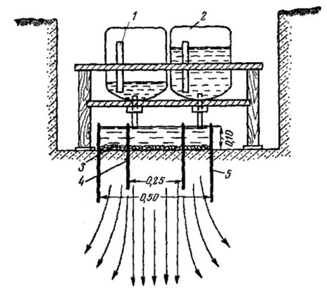 В испытуемой породе вырывают шурф. У бровки шурфа устанавливают два сосуда емкостью по 10...20 л, из которых на дно шурфа по опущенной вниз трубке непрерывно подается вода. Уровень воды в шурфе все время должен оставаться постоянным - около 10 см над уровнем дна. Опыт продолжается до тех пор, пока расход воды не станет более или менее постоянным.